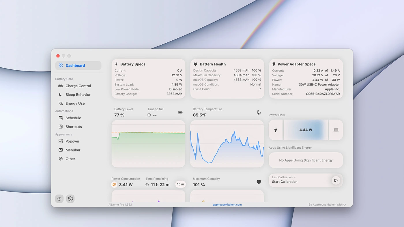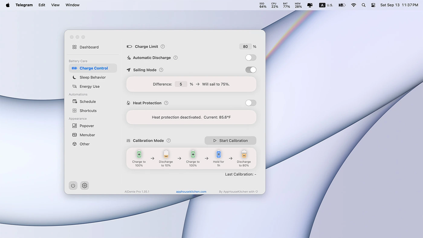 اپلیکیشن AlDente Pro یک ابزار پیشرفته برای مدیریت وضعیت باتری مکبوک است که به کاربران امکان میدهد فرآیند شارژ باتری را با دقت کنترل کنند تا عمر باتری به حداکثر برسد. این نرمافزار به ویژه برای کسانی مناسب است که دستگاه خود را اغلب به برق متصل نگه میدارند و میخواهند از افزایش درصد شارژ تا ۱۰۰٪ یا دمای بالا جلوگیری کنند. با استفاده از AlDente Pro، کاربران میتوانند محدودیت شارژ تنظیم کنند، حالت تخلیه فعال نمایند، دمای باتری را نظارت کنند و گزارشهای جامع درباره سلامت باتری مشاهده کنند.