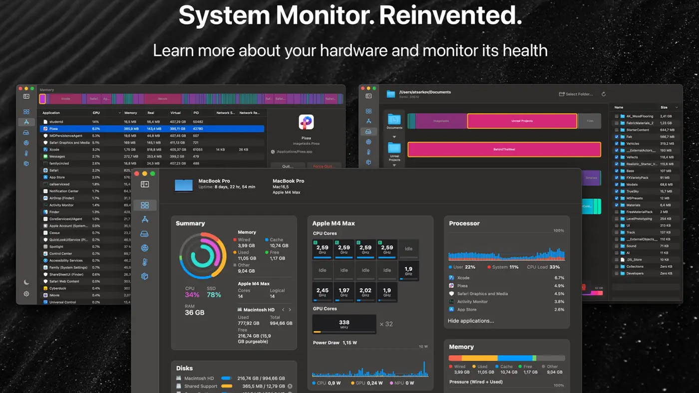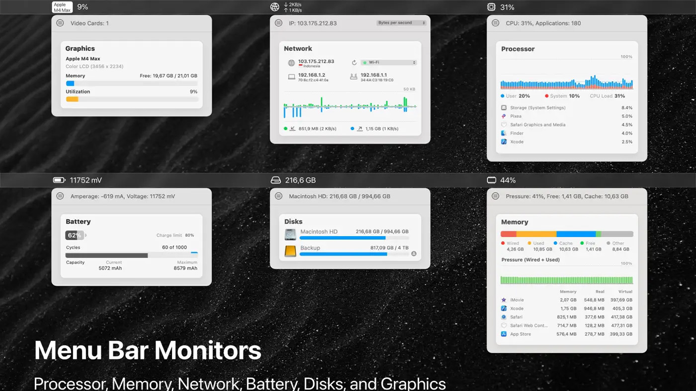 • اعلانات و ویجتها: دارای ویجتهای مرکز اعلان (Notification Center) و گزینههایی در نوار منو (Menu Bar) است که دسترسی سریع به آمار سیستم را فراهم میکند و به شما امکان میدهد برای وضعیتهای مختلف مثل بالا رفتن دمای CPU یا پر شدن دیسک اعلان دریافت کنید.