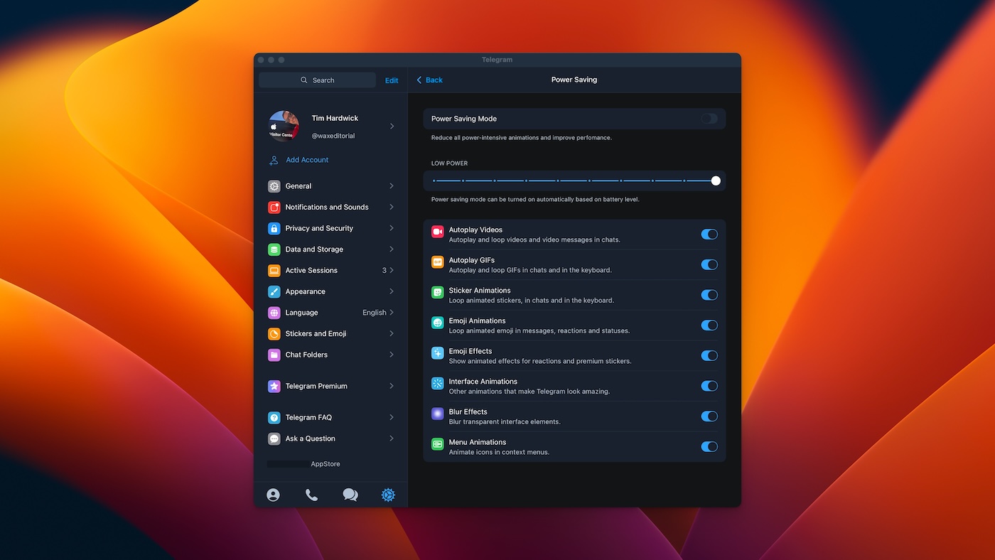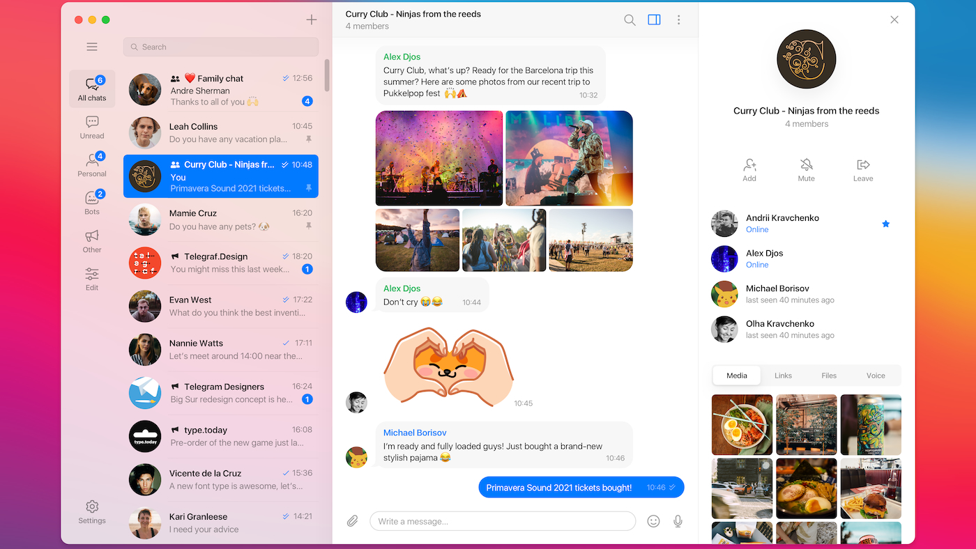 • سرگرم‌کننده: تلگرام دارای ابزارهای ویرایش عکس و ویدئو قدرتمند، استیکرها و ایموجی‌های متحرک، تم‌های قابل تنظیم و یک پلتفرم استیکر و GIF است.
